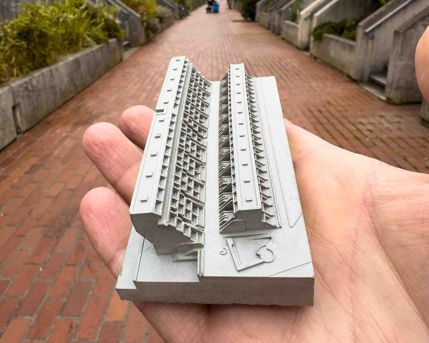 I make miniature concrete models of modern and Brutalist buildings. Each piece is designed and hand-poured in my studio.