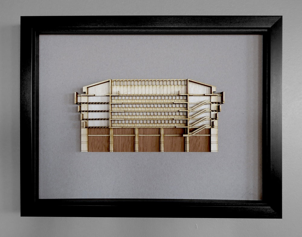 A layered, laser cut and hand assembled piece portraying a 3D cross section of John Madin’s Central Library in Birmingham, UK.