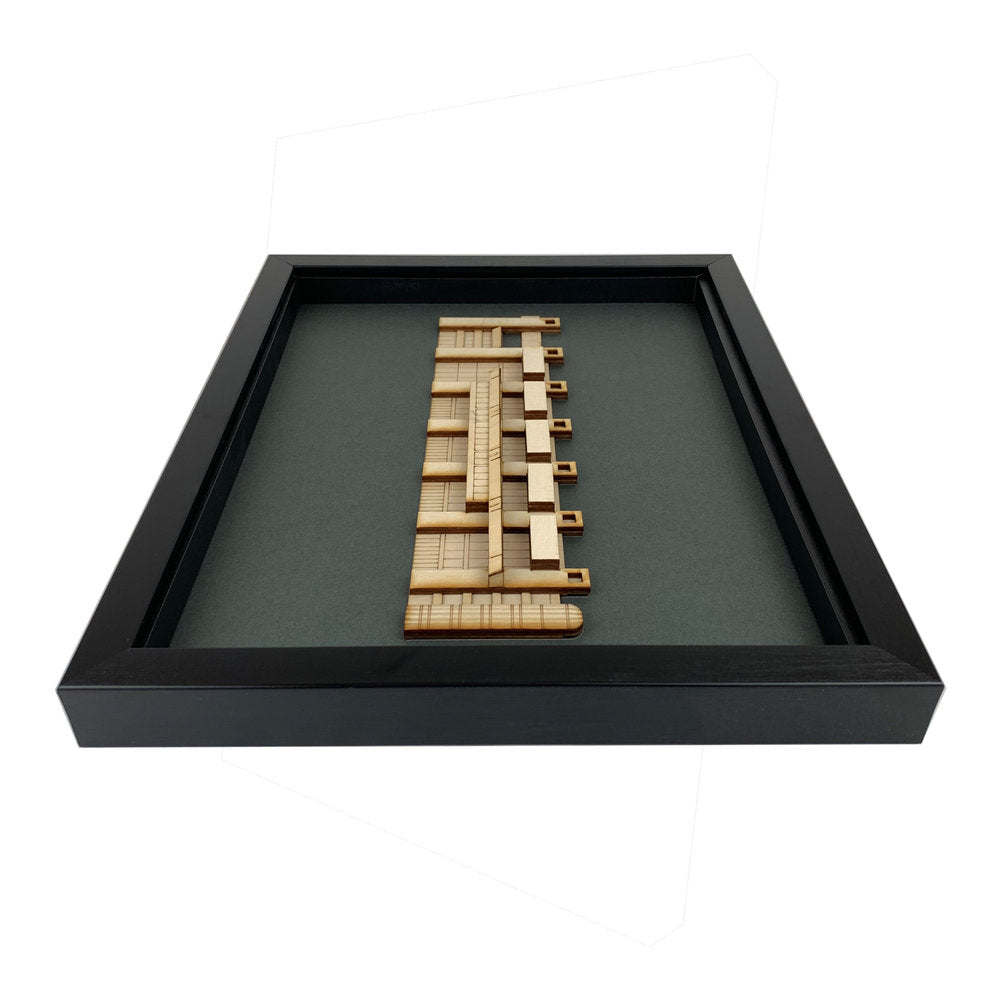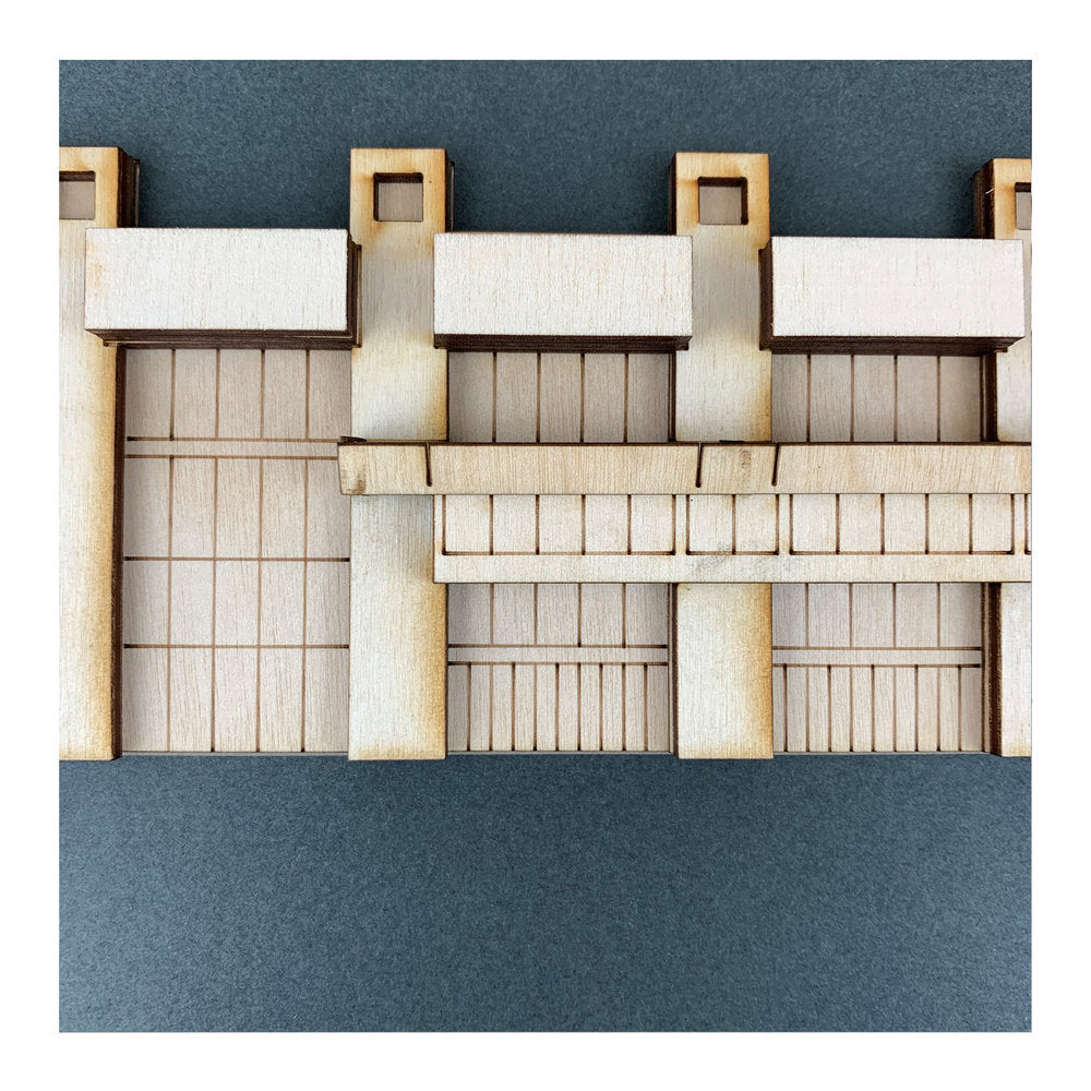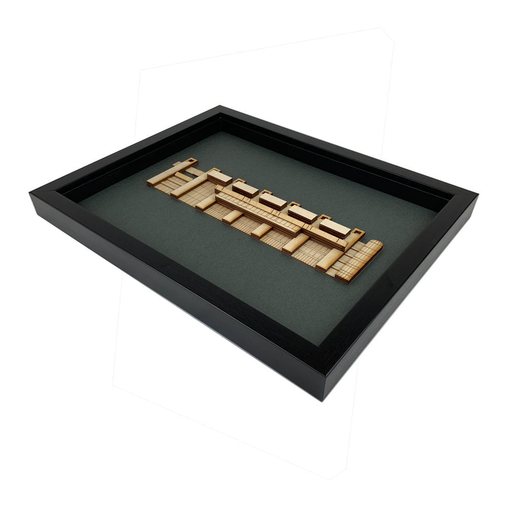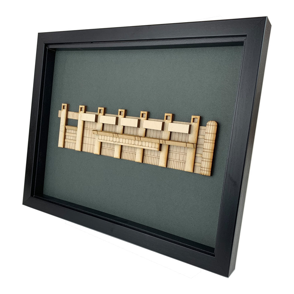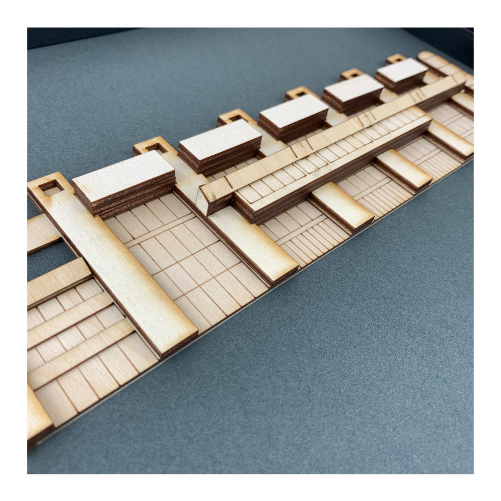 A layered, lasercut, hand assembled 3D elevation artwork portraying the Barbican Centre designed by Chamberlin, Powell and Bon. Birch plywood is used to represent this bold and striking brutalist great.