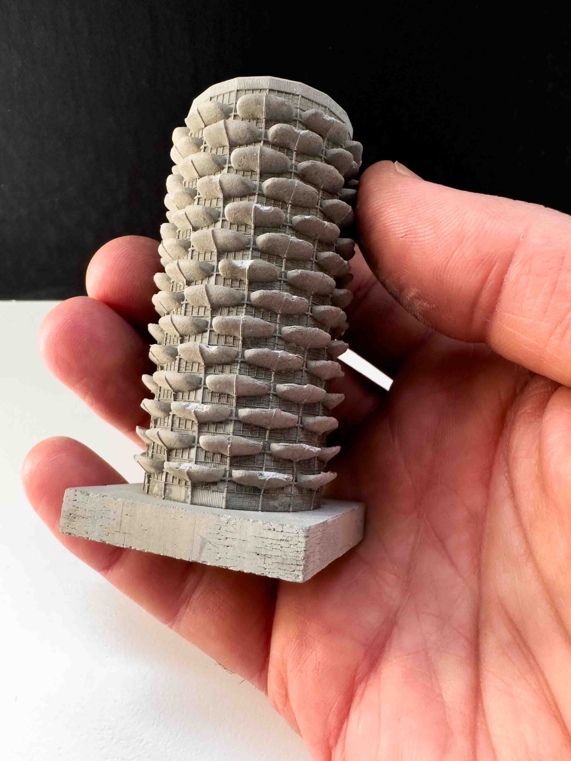 This model celebrates one of those towers in miniature. The petal-shaped balconies, the cylindrical form, and the vertical rhythm were carefully reduced to scale. I wanted the cast to hold the same playful character and distinctive silhouette that make the towers unforgettable.