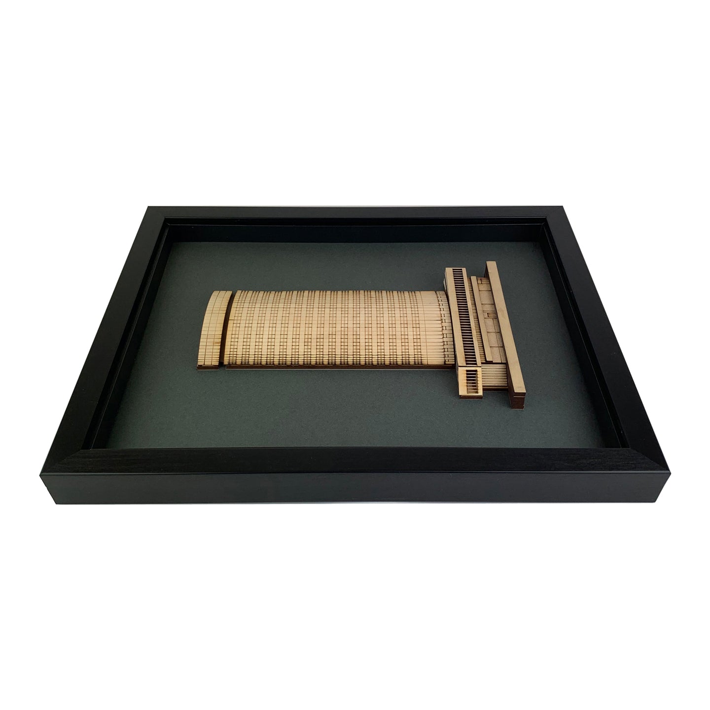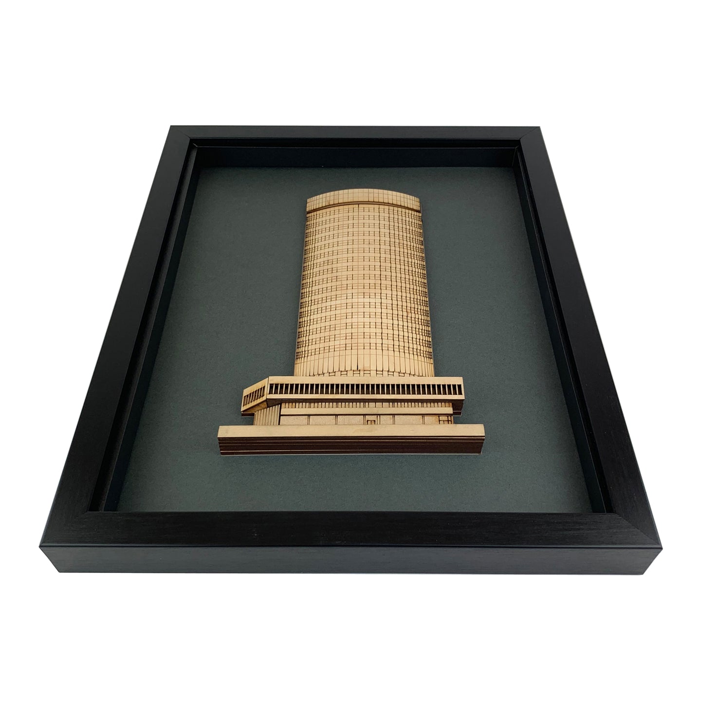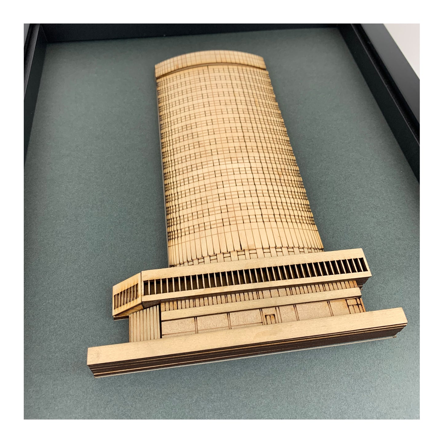 A layered, lasercut, hand assembled 3D perspective artwork, using birch plywood to portray Birmingham's iconic Rotunda- designed by Jim Roberts and completed in 1965.