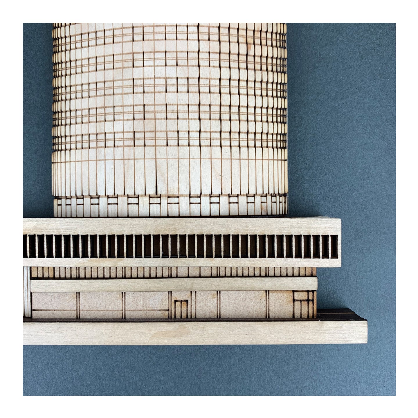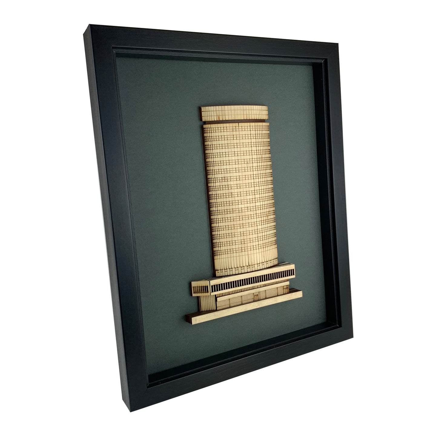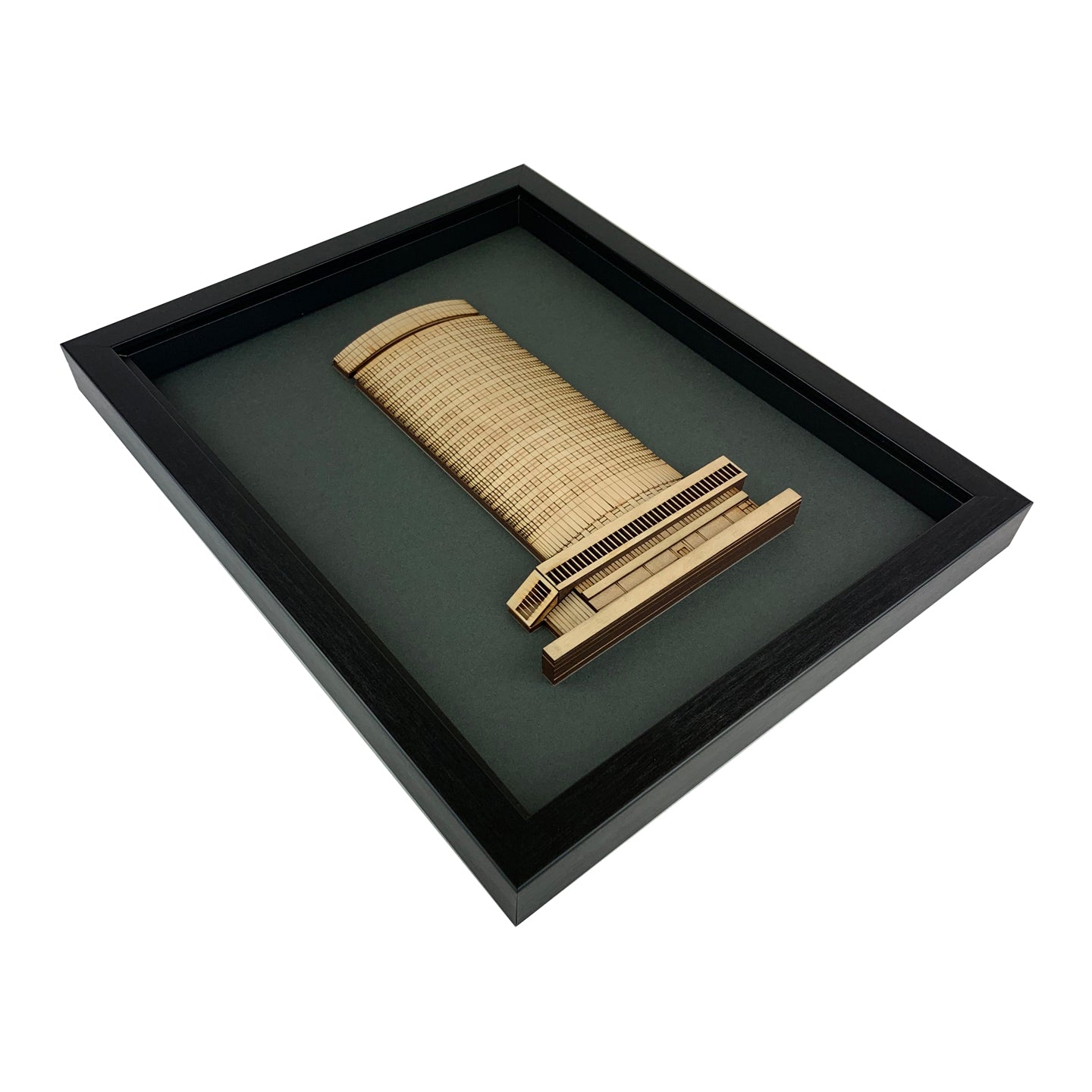 A layered, lasercut, hand assembled 3D perspective artwork, using birch plywood to portray Birmingham's iconic Rotunda- designed by Jim Roberts and completed in 1965.