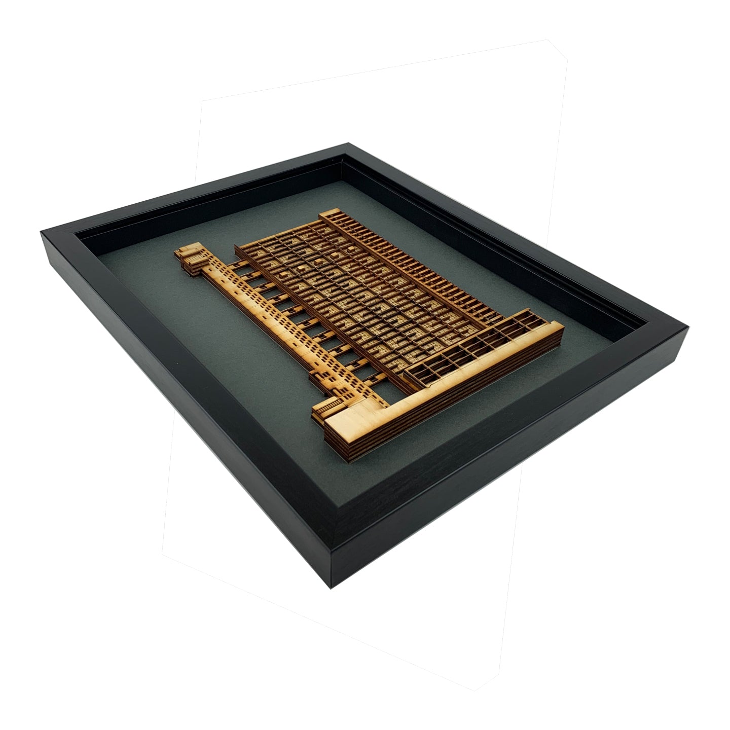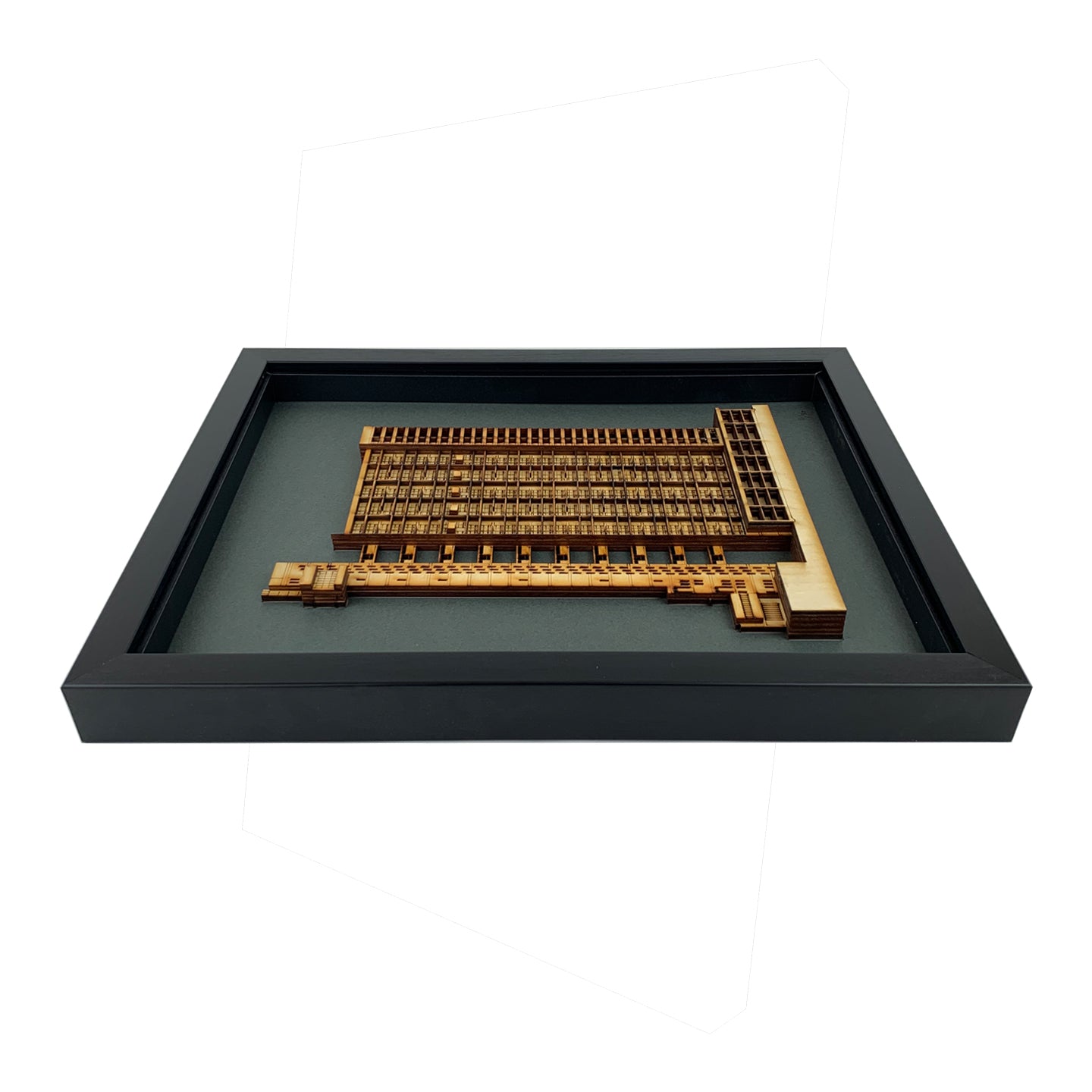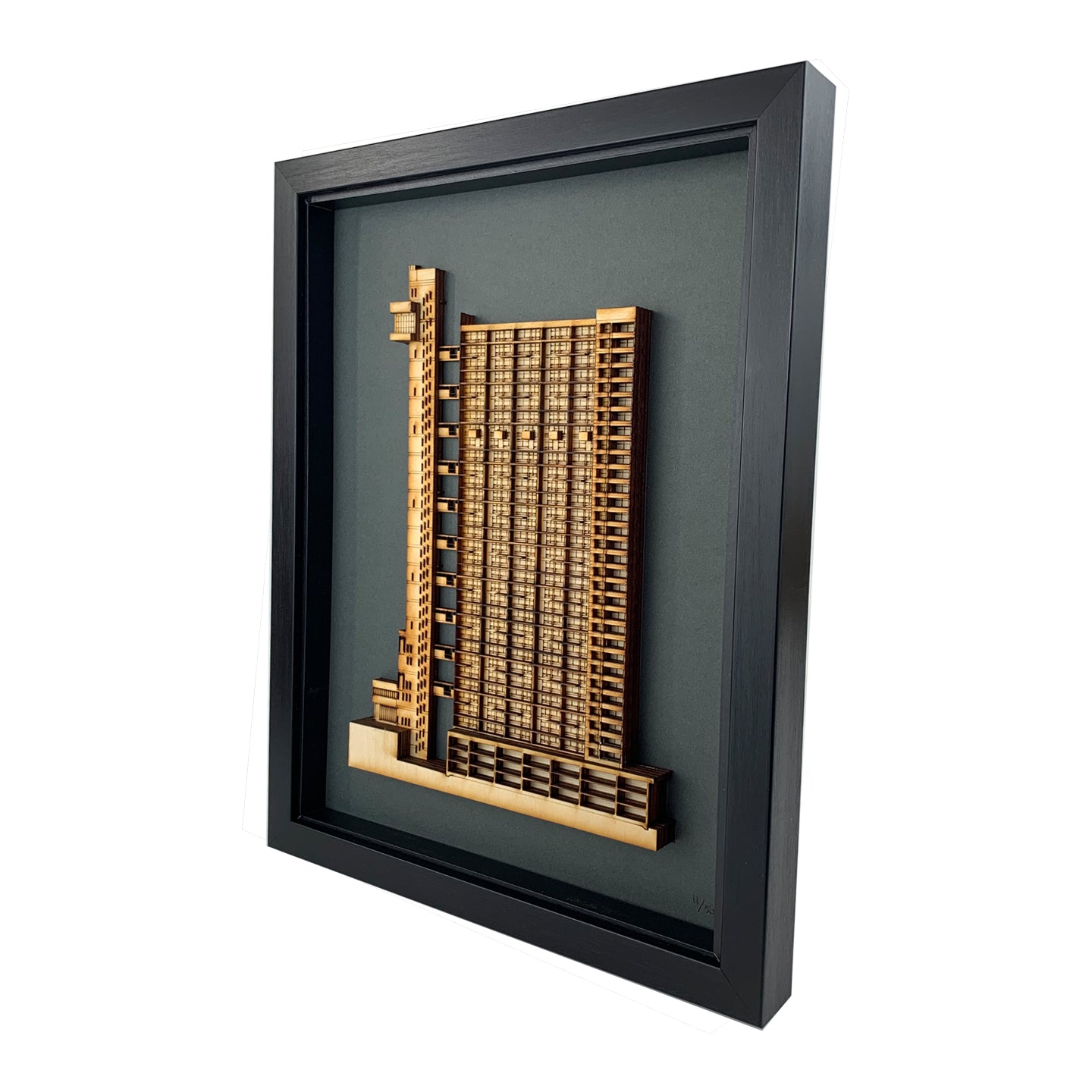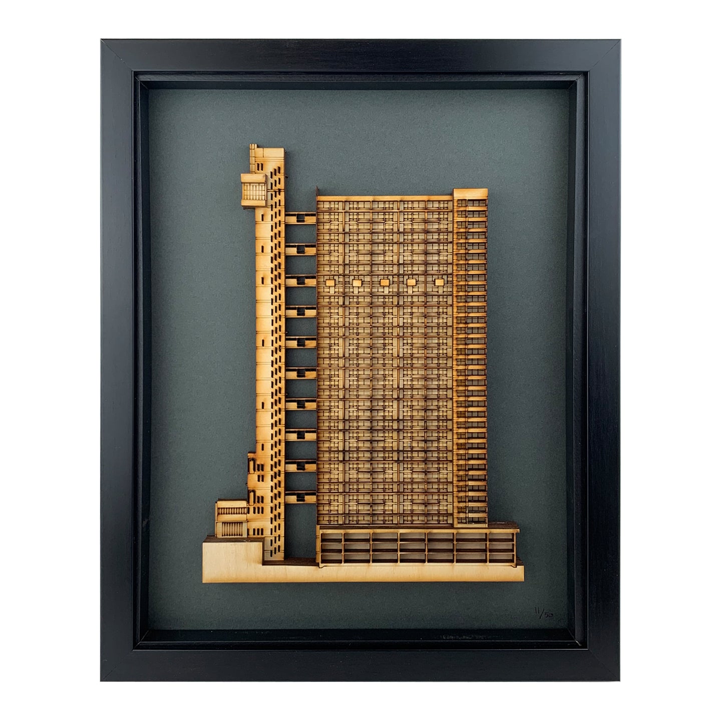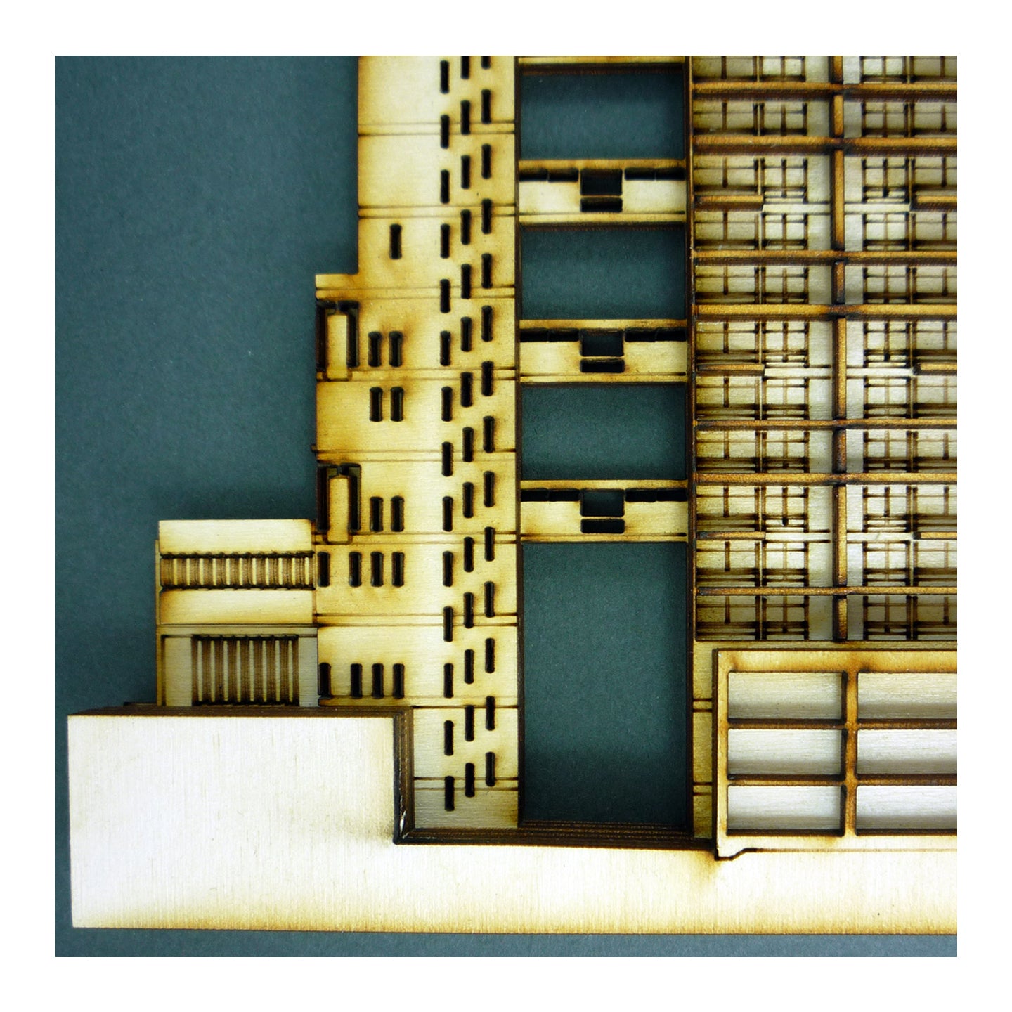 A layered, lasercut, hand assembled 3D elevation portraying the infamous Trellick Tower designed by Erno Goldfinger, 1972. Birch plywood is used to represent the brutalist concrete frame building, showing the separated staircore tower and bridge link corridors.